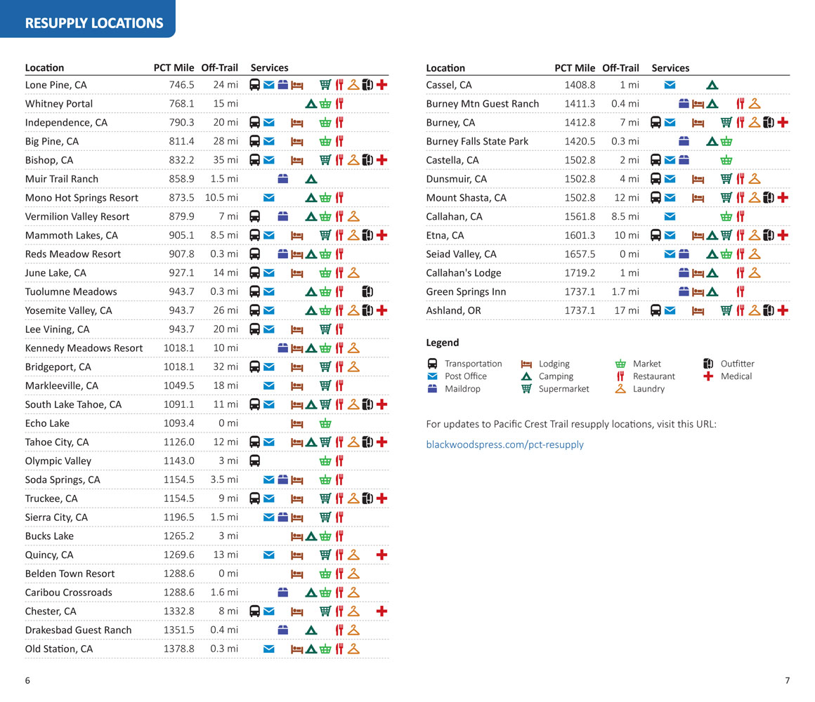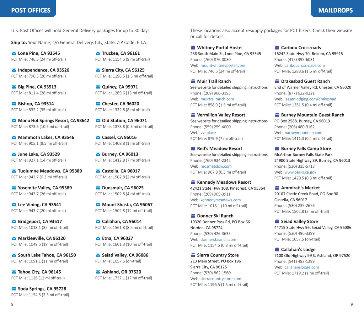 - Resupply Locations and Services: Post offices, maildrops, transportation, food, lodging, outfitters and more