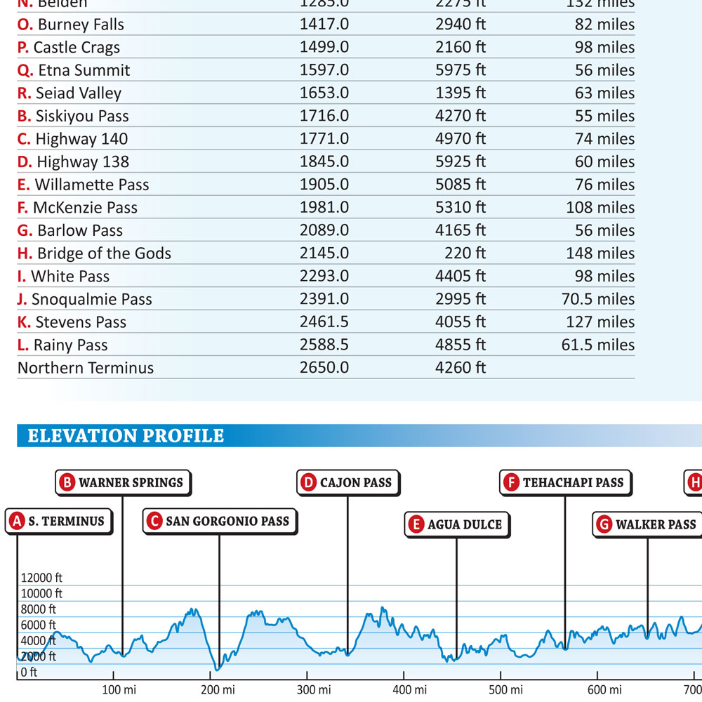 - Elevation Profile: Showing all the peaks, passes and valleys along the Pacific Crest Trail route