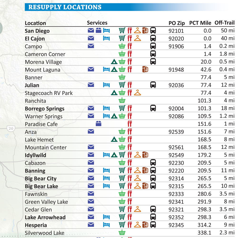 - Resupply Locations and Services: Post offices, maildrops, transportation, food, lodging, outfitters and more