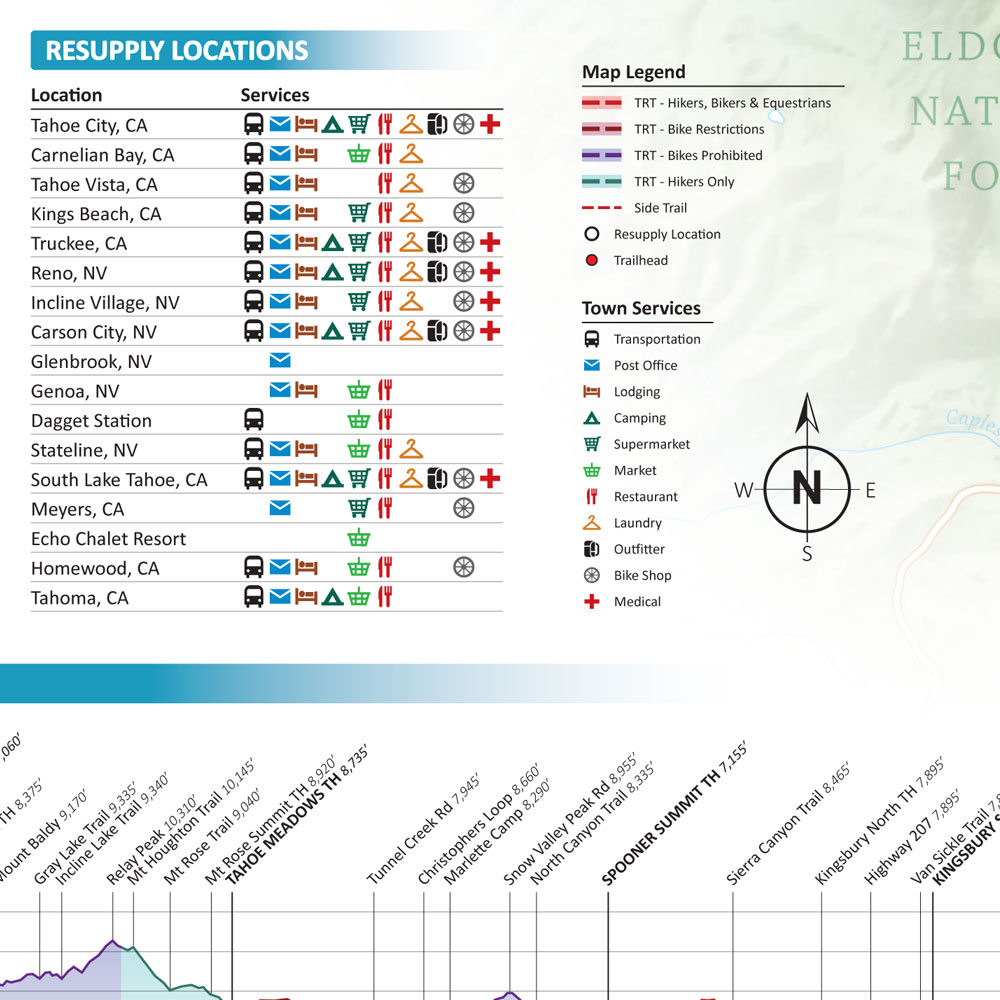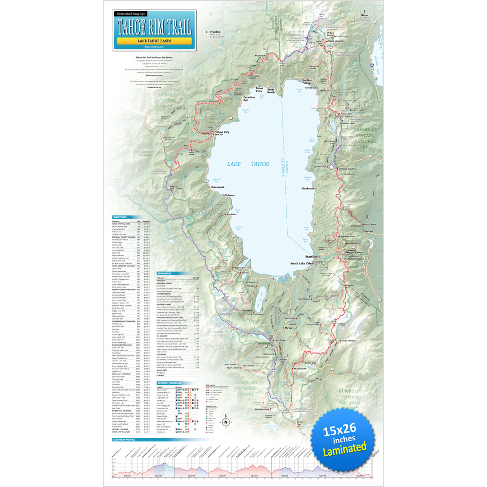Tahoe Rim Trail Wall Map shows the entire 171 mile Tahoe Rim Trail around Lake Tahoe, with mileage and elevation data, side trails, alternate routes, trailheads, elevation profile, resupply locations, town services and other points of interest.